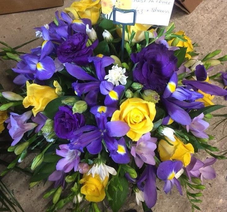 Yellow roses and seasonal bright yellow and purple flowers are arranged by our talented and experienced florists into this stunning funeral posy arrangement