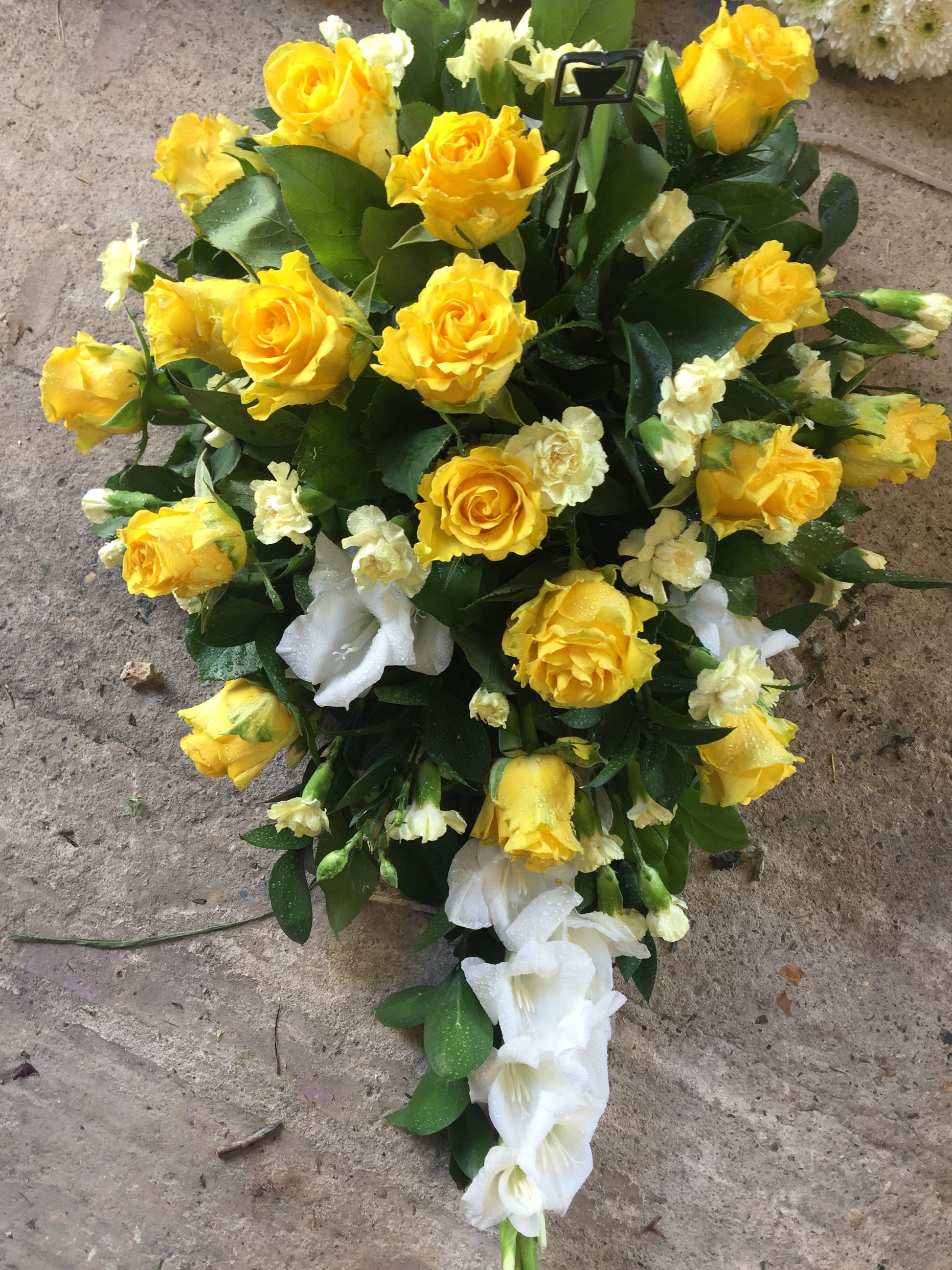 includes roses and mini spray carnations and white gladioli flowers arranged with lush green foliage