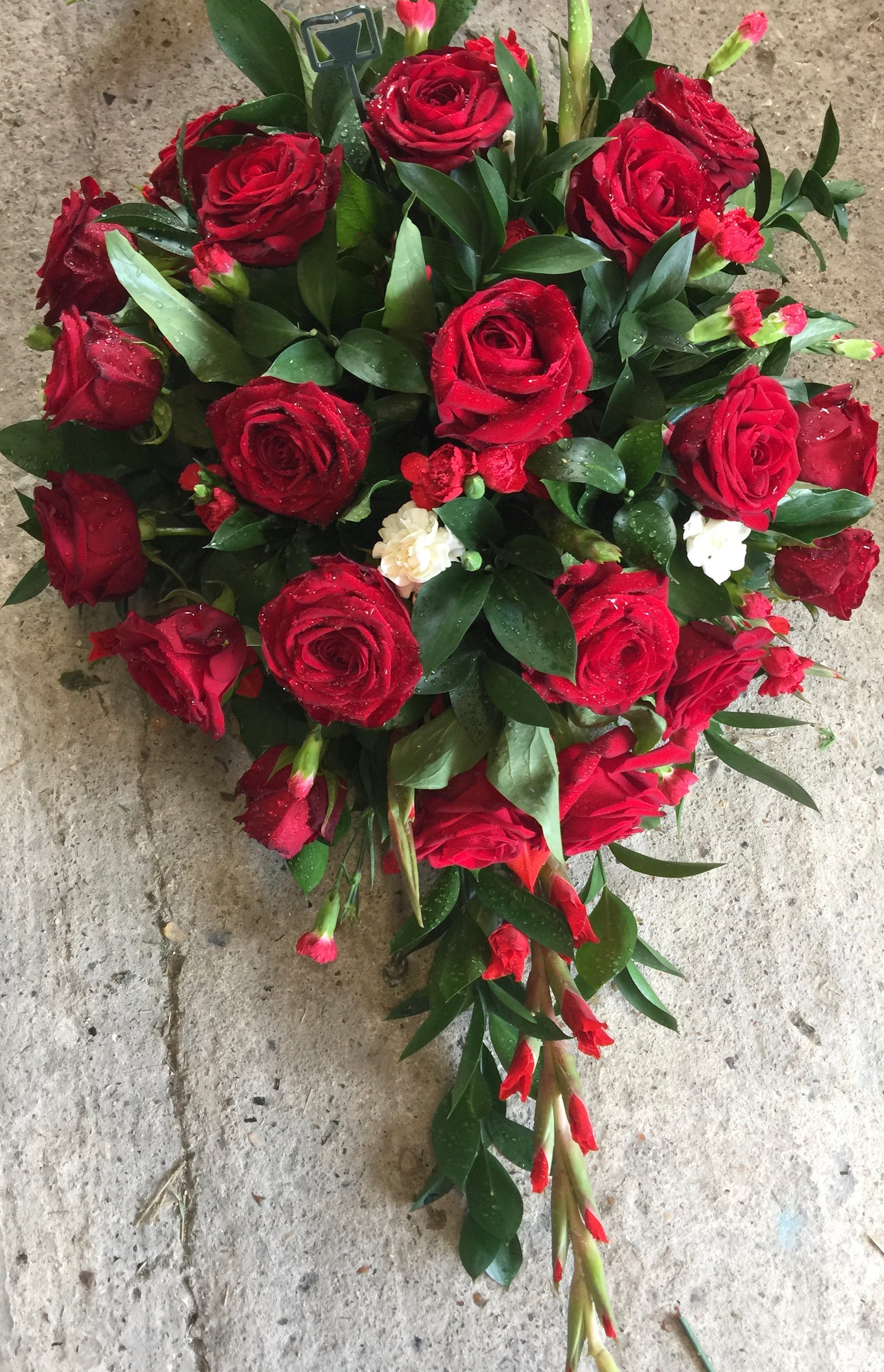 includes roses and mini spray carnations and white seasonal flowers arranged with lush green foliage