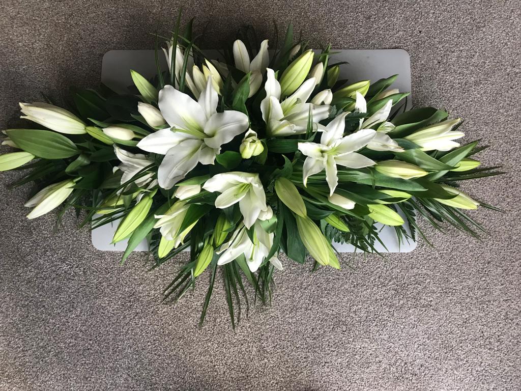 The lily funeral coffin spray is a classic and elegant arrangement to be placed on the top of the coffin
